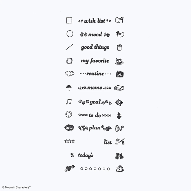 軽いタッチで鮮明に捺印できるスタンプで、ムーミンのキャラクターやモチーフを自由に組み合わせられます。