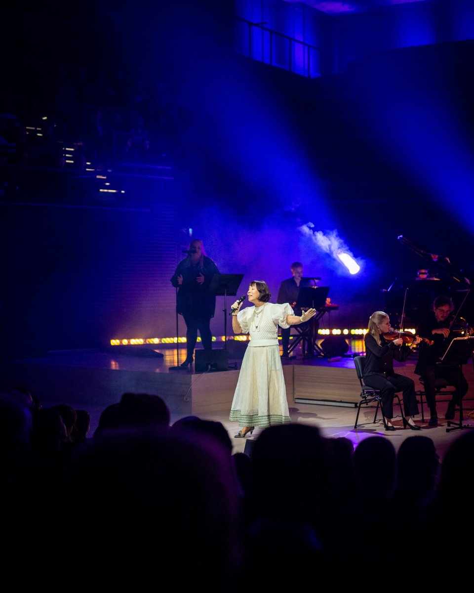 そして、ヘルシンキで行われた初めてのムーミンミュージックコンサートは、白鳥一家にとってもまたいまだかつてない体験となりました。自身もシンガーソングライターとして活躍している娘の白鳥マイカさんたちと共に、家族でフィンランドを訪れたのです。世界中から会場に詰めかけたムーミンファンの観客に向けて、英美子さんは日本版主題歌『夢の世界へ』を披露しました。