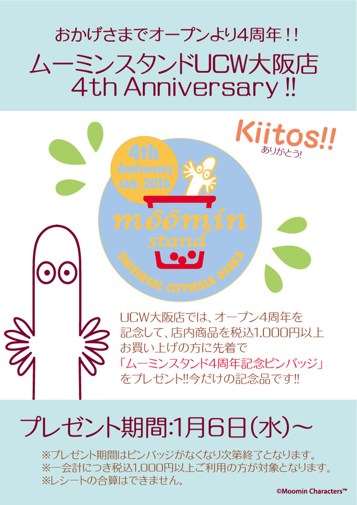 ムーミンスタンド ユニバーサル・シティウォーク大阪店 4周年アニバーサリー! 2015.12.14 もい! ムーミンスタンド ユニバーサル・シティウォーク大阪店が 2016年1月6日(水)で4周年を迎えます アニバーサリーを記念して 期間中、店内お買上合計金額 1,000円(税込)で 「ムーミンスタンド4周年記念ピンバッヂ」 をプレゼントいたします! 期間:2016年1月6日(水)~ 実施店舗:ムーミンスタンド ユニバーサル・シティウォーク大阪店 ※なくなり次第終了となりますのでお早目にどうぞ! Related articles 2026.01.27 リトルミイフェア 2026年新商品が登場!さまざまな表情のリトルミイをモチーフにした マグやクッション、バッグなどの多彩なアイテムが発売。 2026.02.01 【開催情報】2026年2月 物販催事・イベント情報 2026.01.30 残り開催期間わずか!!大好評開催中のムーミン谷の物語を巡る体験型イベント 「ムーミンと光の世界」 Tags #ムーミンショップ #リトルミイ #MOOMINSHOP #グッズ情報 #ムーミン #スナフキン #新商品 #宝島社 #ニョロニョロ #ムーミン公式ファンクラブ #ベルメゾン #キャンペーン #ムーミンママ #ムーミントロール #ムーミンパパ #スイーツ #バッグ #暮らし #Online Shop #お知らせ