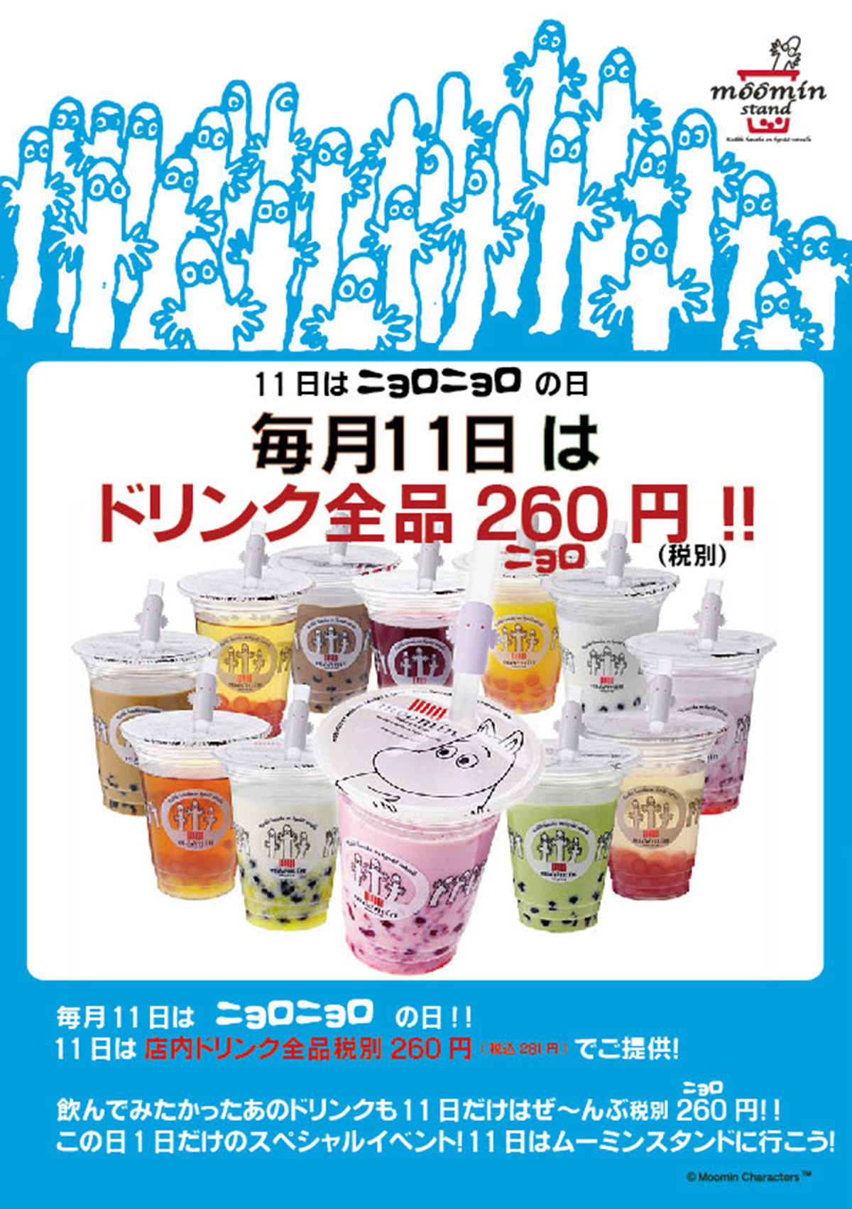 ムーミンスタンド 1月のニョロニョロの日は・・・ 2016.01.05 もい! みなさま 新年、明けましておめでとうございます! 2016年 1月11日のニョロニョロの日は・・・ ドリンク全品260円+税でご提供いたします この日だけのスペシャルプライス こちら ムーミンスタンド全店での実施となっております! フェアメニューもお得に楽しめるので この機会にぜひ お近くのムーミンスタンドへご来店ください それでは もいもーい! ムーミンスタンド http://www.benelic.com/moomin_cafe/moominstand/shop/ Related articles 2026.02.01 【開催情報】2026年2月 物販催事・イベント情報 2026.01.13 【パンづくりで楽しむムーミンの世界】 料理教室との限定コラボレッスンが登場! 2026.01.27 リトルミイフェア 2026年新商品が登場!さまざまな表情のリトルミイをモチーフにした マグやクッション、バッグなどの多彩なアイテムが発売。 Tags #ムーミンショップ #リトルミイ #MOOMINSHOP #グッズ情報 #ムーミン #スナフキン #新商品 #宝島社 #ニョロニョロ #ムーミン公式ファンクラブ #ベルメゾン #キャンペーン #ムーミンママ #ムーミントロール #ムーミンパパ #スイーツ #バッグ #暮らし #Online Shop #お知らせ