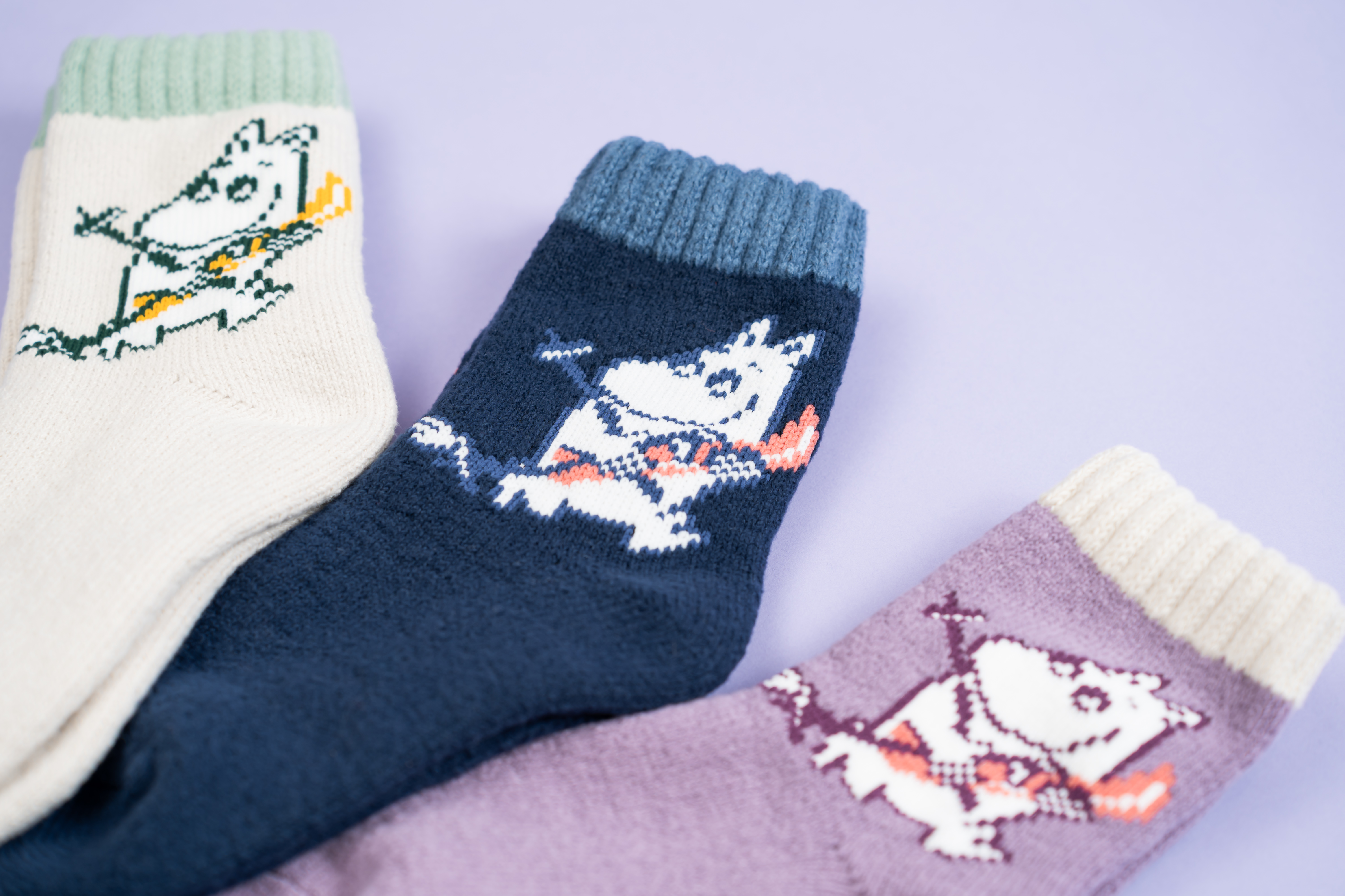 寒い季節に活躍するホームソックス。スキーをするムーミンの柄が編み込まれていて、やわらかな素材感と足元を包み込むフィット感が特徴です。カラーは3色展開で、室内でも気分に合わせて楽しめます。(株式会社ウイックス)
