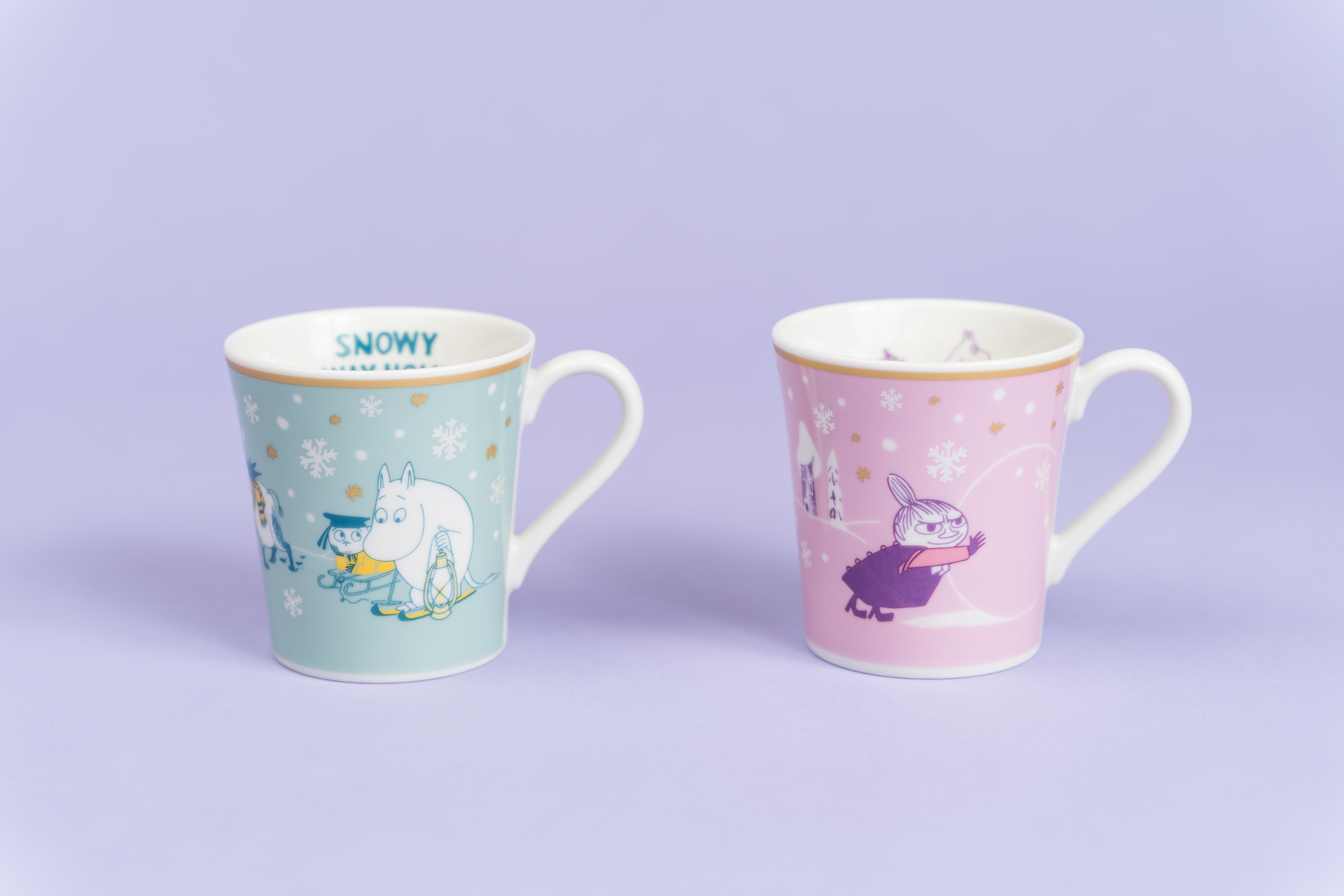雪遊びを楽しむムーミンたちが描かれたマグカップ。やさしいブルーのムーミン柄と、あたたかみのあるパープルを基調にしたリトルミイ柄の2種類がラインアップされています。冬のティータイムを楽しく彩るデザインです。(株式会社山加商店)