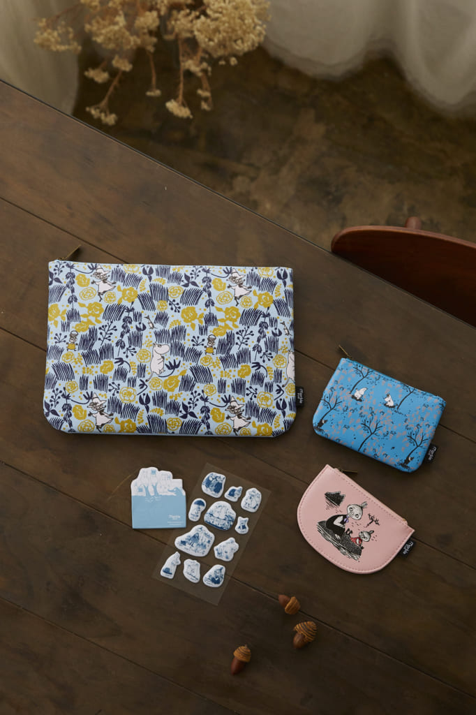 ティッシュポケット付きのポーチは木々を揺らすミイとムーミンたちが可愛い鮮やかなブルー。