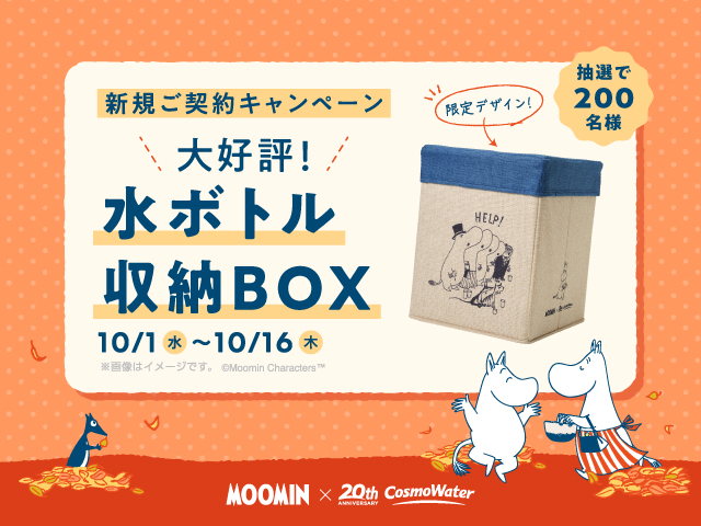 コスモウォーターのウォーターサーバーをご契約いただいた方から抽選で200名様に、MOOMIN×CosmoWater20周年限定デザインの「水ボトル収納BOX」をプレゼント!