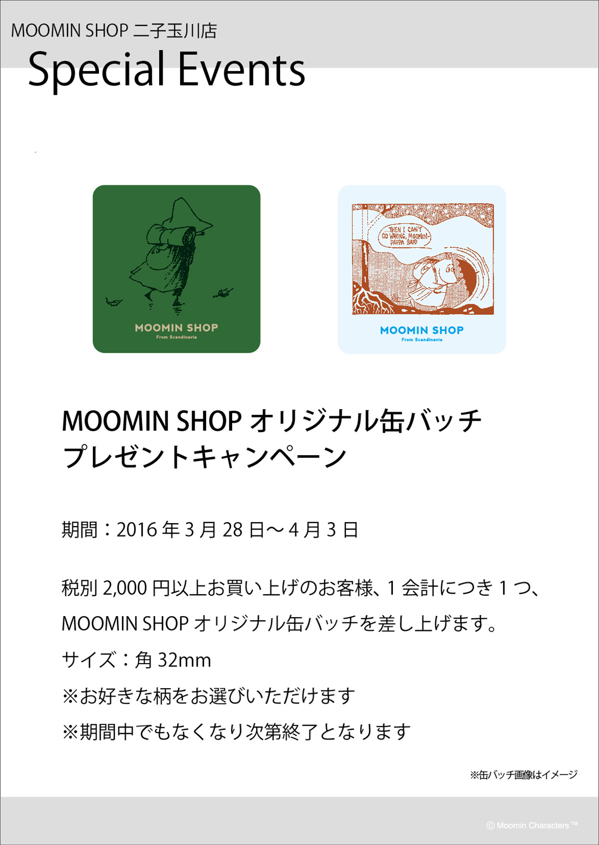 MOOMIN SHOP二子玉川店からオリジナル缶バッヂプレゼントキャンペーン第二弾! 2016.03.22 Moi! ご好評につき またまた MOOMIN SHOP二子玉川店から オリジナル缶バッヂプレゼントキャンペーン! 実施店舗:MOOMIN SHOP二子玉川店 期間:2016年3月28日~2016年4月3日 期間中、税別2,000円以上お買上げのお客様 1会計につき1つオリジナル缶バッヂ(非売品)プレゼント! この機会に お早目にご来店くださいませ! それでは Moimoi! Related articles 2026.01.09 今年も郵便局限定『ムーミン』グッズが登場!発売記念キャンペーンも開催! 2026.01.23 「ネームワッペンが可愛い」サコッシュショルダー登場!予約販売開始!! 2026.01.16 【MOOMIN SHOP ONLINE】12月の人気商品ランキングをご紹介♪最新情報もお届け! Tags #ムーミンショップ #リトルミイ #MOOMINSHOP #グッズ情報 #ムーミン #スナフキン #新商品 #宝島社 #ニョロニョロ #ムーミン公式ファンクラブ #ベルメゾン #キャンペーン #ムーミンママ #ムーミントロール #ムーミンパパ #スイーツ #バッグ #暮らし #Online Shop #お知らせ