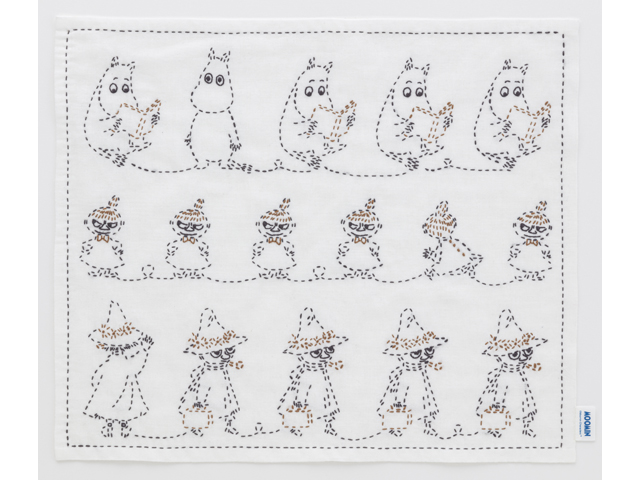 ムーミン、リトルミイ、スナフキンが横に並んだリズミカルな図柄を2色の刺し子糸で大人っぽく刺し分けて。人気キャラクターの豊かな表情も楽しいアイテムには、ネームタグがセット済み。