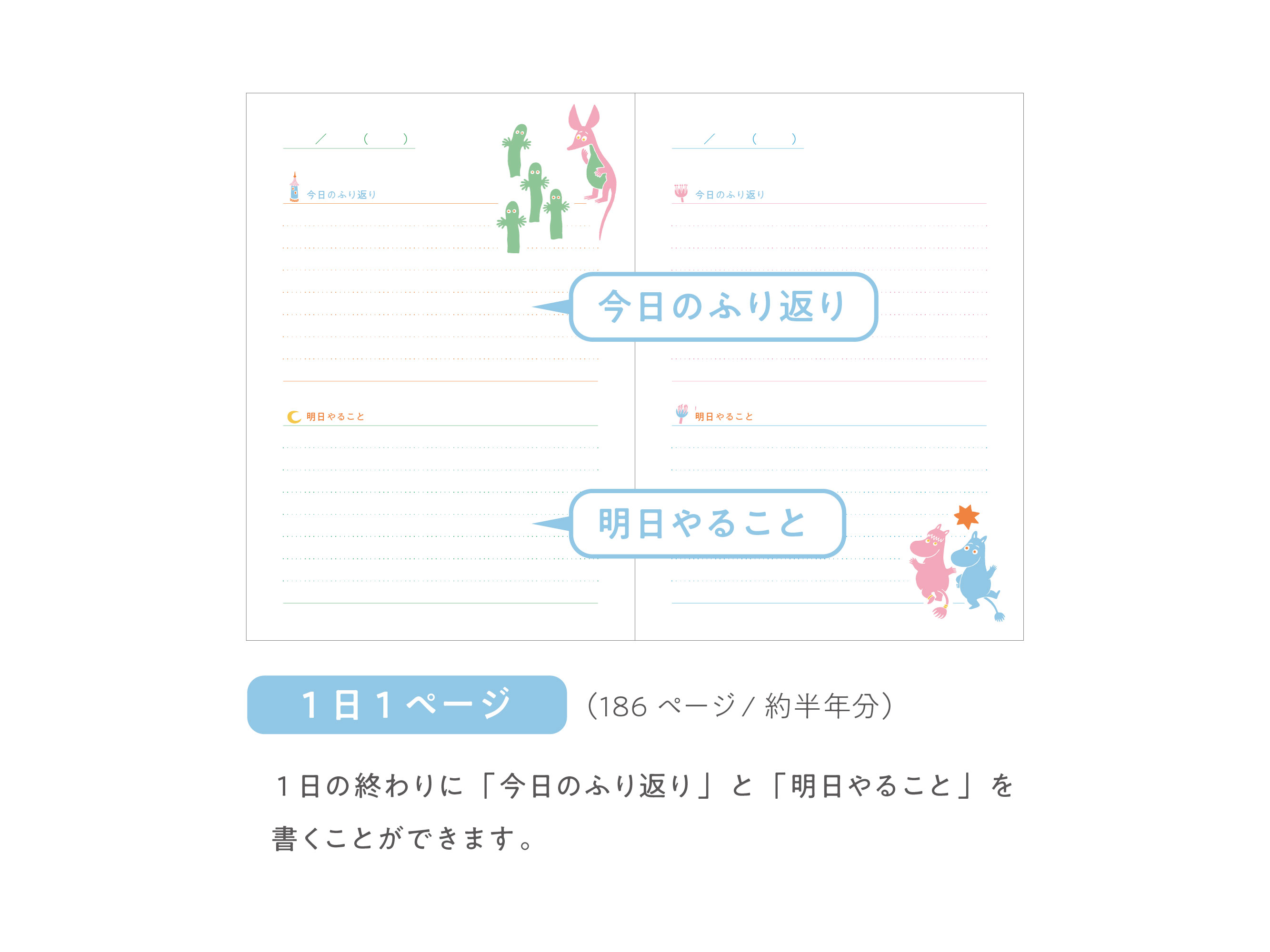 1日の終わりに「今日のふり返り」と「明日やること」を書くことができるレイアウト。