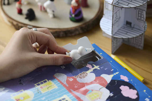 フィギュアだけでなく、組み立てて作る紙製のムーミンやしきのパーツ入り!