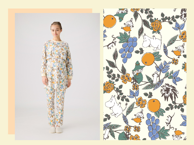 マタニティパジャマは、大きなフルーツの中に楽しそうなムーミンたちが登場するプリント柄