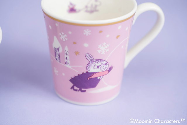 雪遊びを楽しむムーミンたちが描かれたマグカップ。やさしいブルーのムーミン柄と、あたたかみのあるパープルを基調にしたリトルミイ柄の2種類がラインアップされています。冬のティータイムを楽しく彩るデザインです。