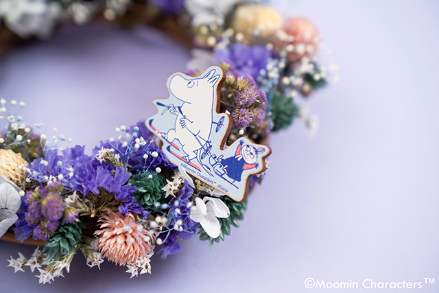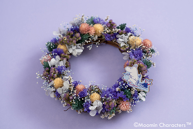 パープルの花材をメインに使ったドライリースに、スキーを楽しむムーミンの飾りを添えました。ナチュラルな素材感と北欧らしい遊び心が調和したデザインが季節のインテリアにぴったりです。