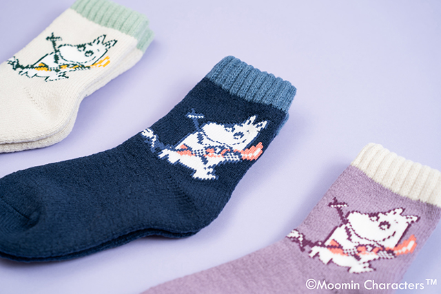 寒い季節に活躍するホームソックス。スキーをするムーミンの柄が編み込まれていて、やわらかな素材感と足元を包み込むフィット感が特徴です。カラーは3色展開で、室内でも気分に合わせて楽しめます。