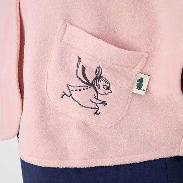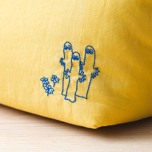 ぽこぽことしたあたたかみのある生地に、ムーミンやリトルミイ、ニョロニョロの刺繍が映えます。