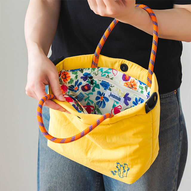 外側はシンプルに、内側は花柄で華やかに。手持ち・ショルダーの2WAYで使えるバッグです。