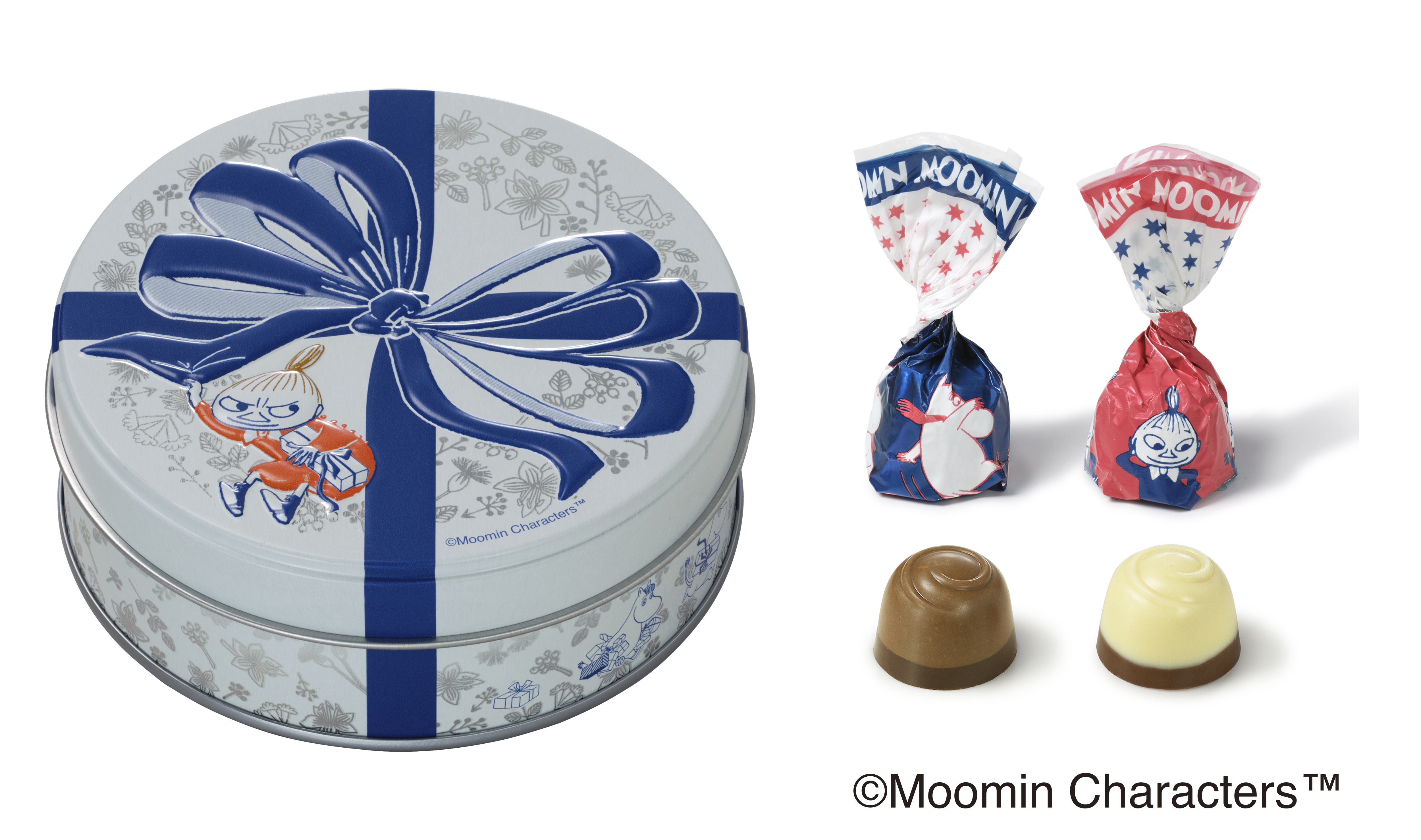 プレゼントを抱えて飛び回るリトルミイをデザインした手のひらサイズの缶。ミルクとホワイトのパフ入りチョコレートをそれぞれムーミンとリトルミイのデザインで包みました。