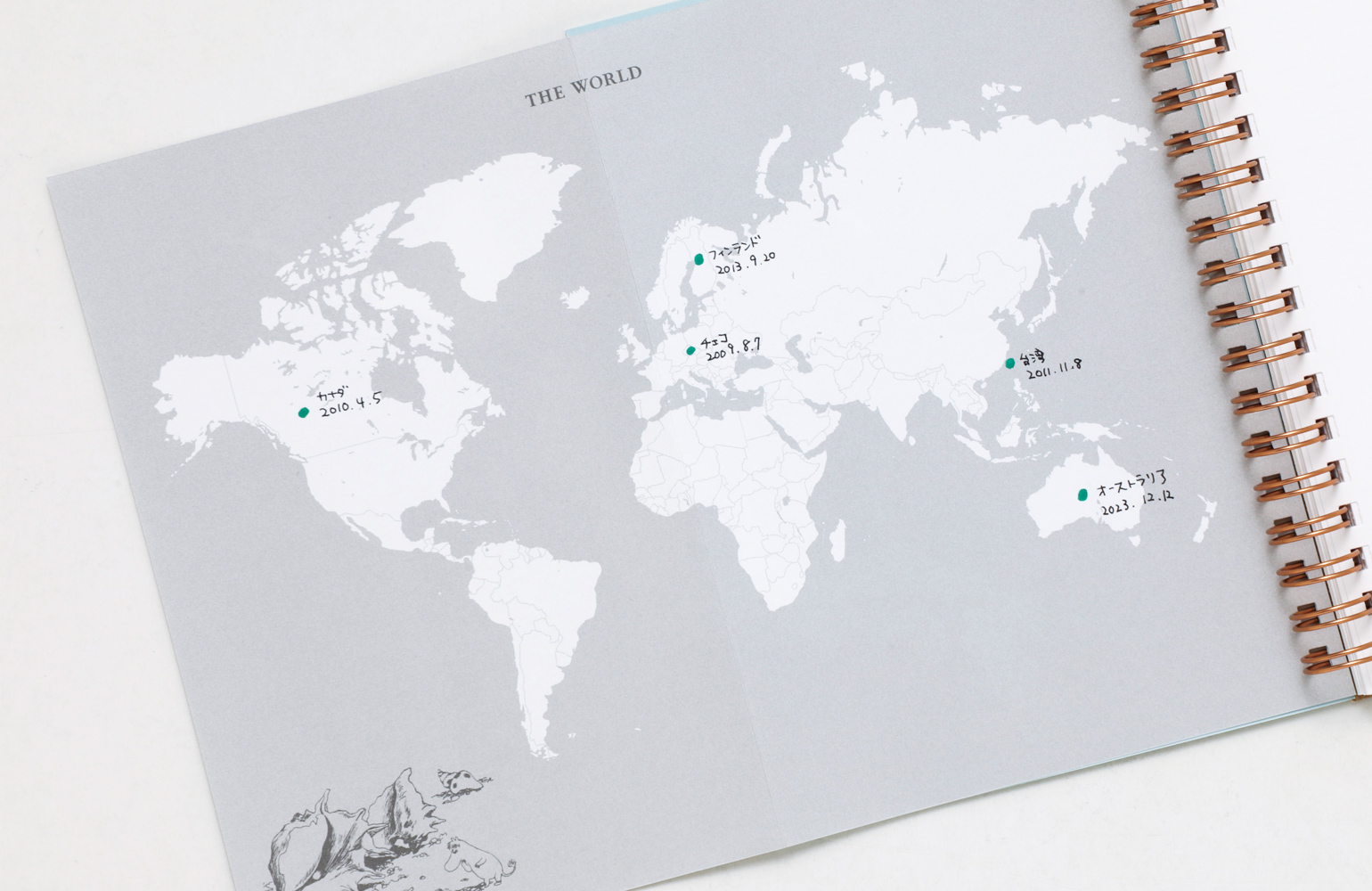 見開きの日本地図と世界地図には、訪れた場所をスタンプでマークしたり、メモを書き込んだりと、旅の足跡を残せます。