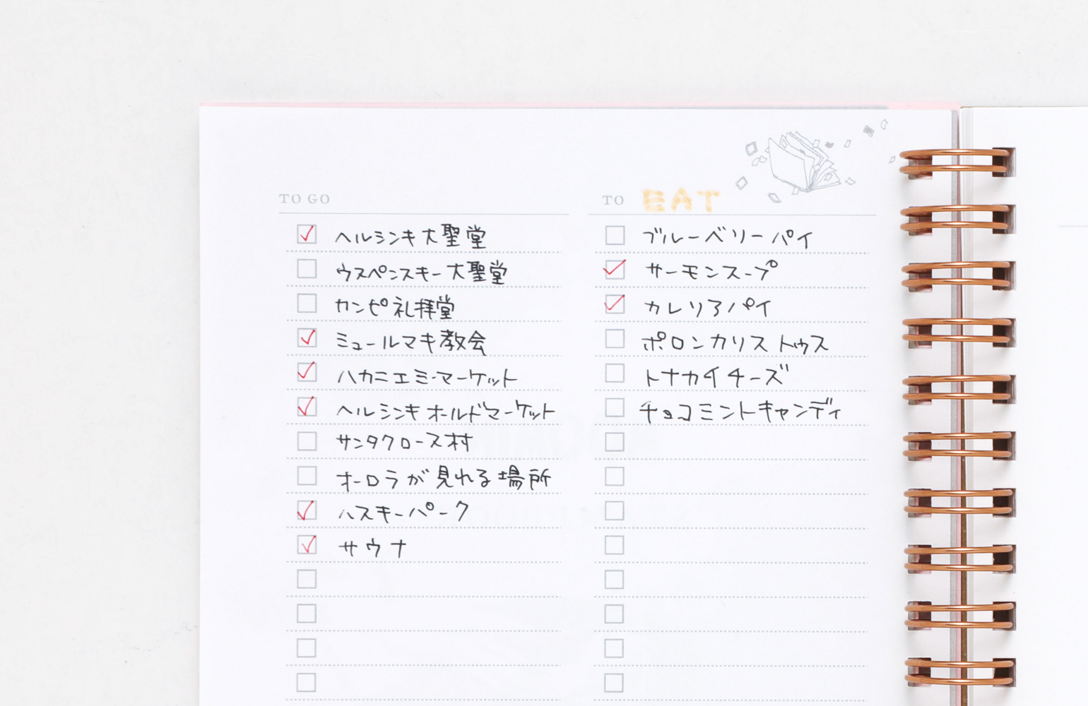 ToDoリストや罫線のないシンプルなノートページもあり、旅の準備や記録にぴったりです。