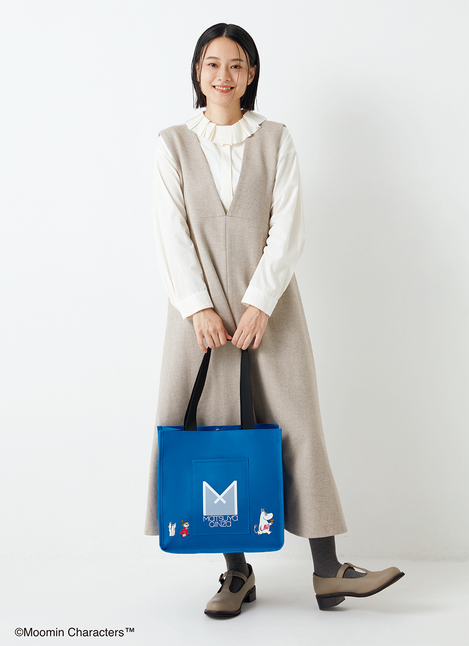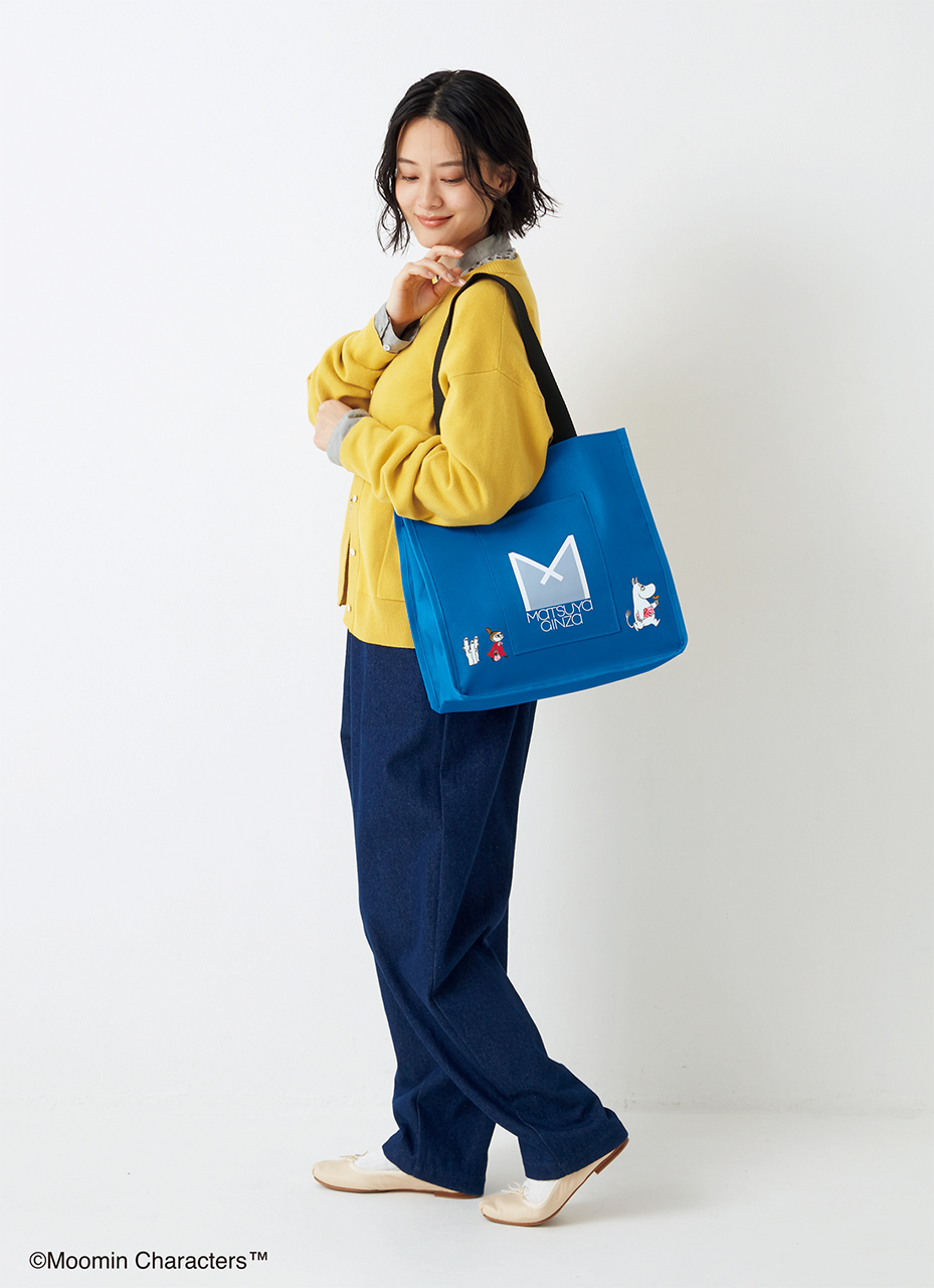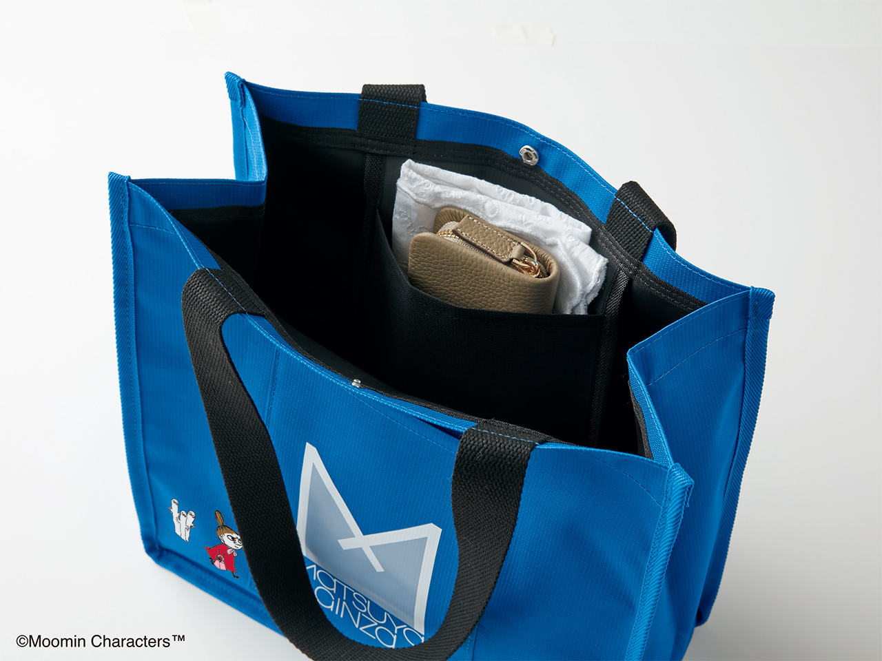 フロントポケットには当時の松屋のロゴ“Mマーク”を配し、前面と後面にはムーミンたちがお買い物を楽しんでいるような愛らしいアートをあしらいました。