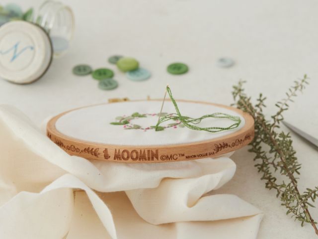 刺しゅう枠の側面に、ムーミントロール・リトルミイ・スナフキンのシルエットと、ボタニカルなイラストがプリントされています。