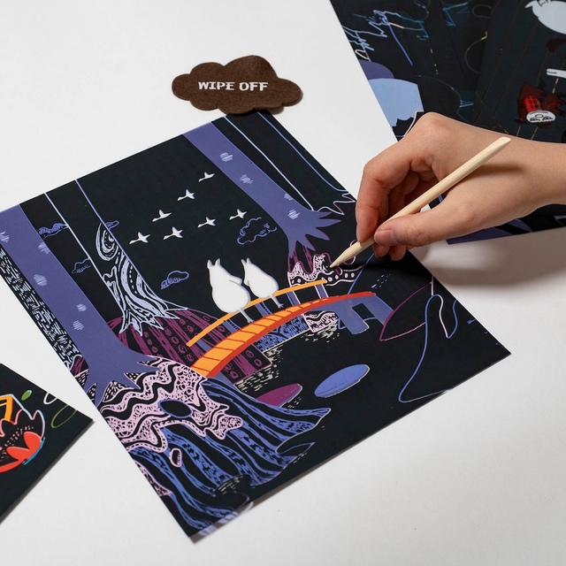 木製のペンで削ると、下からカラフルな色が現れるスクラッチアート。