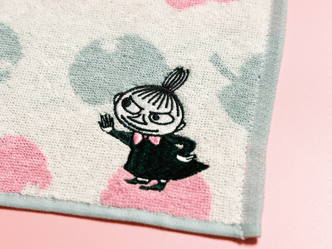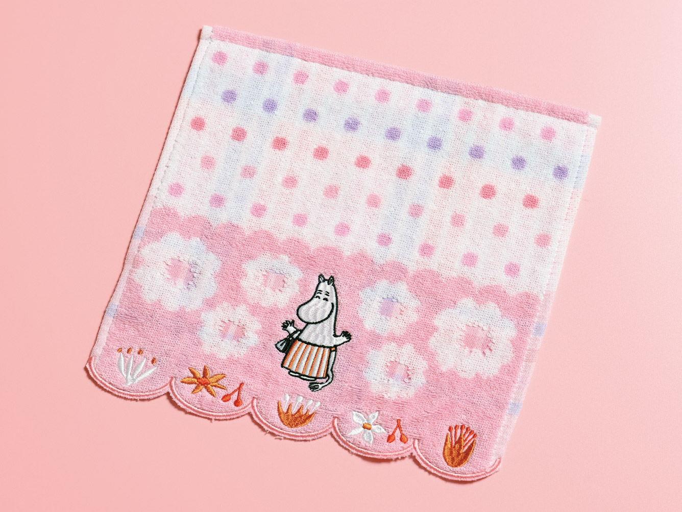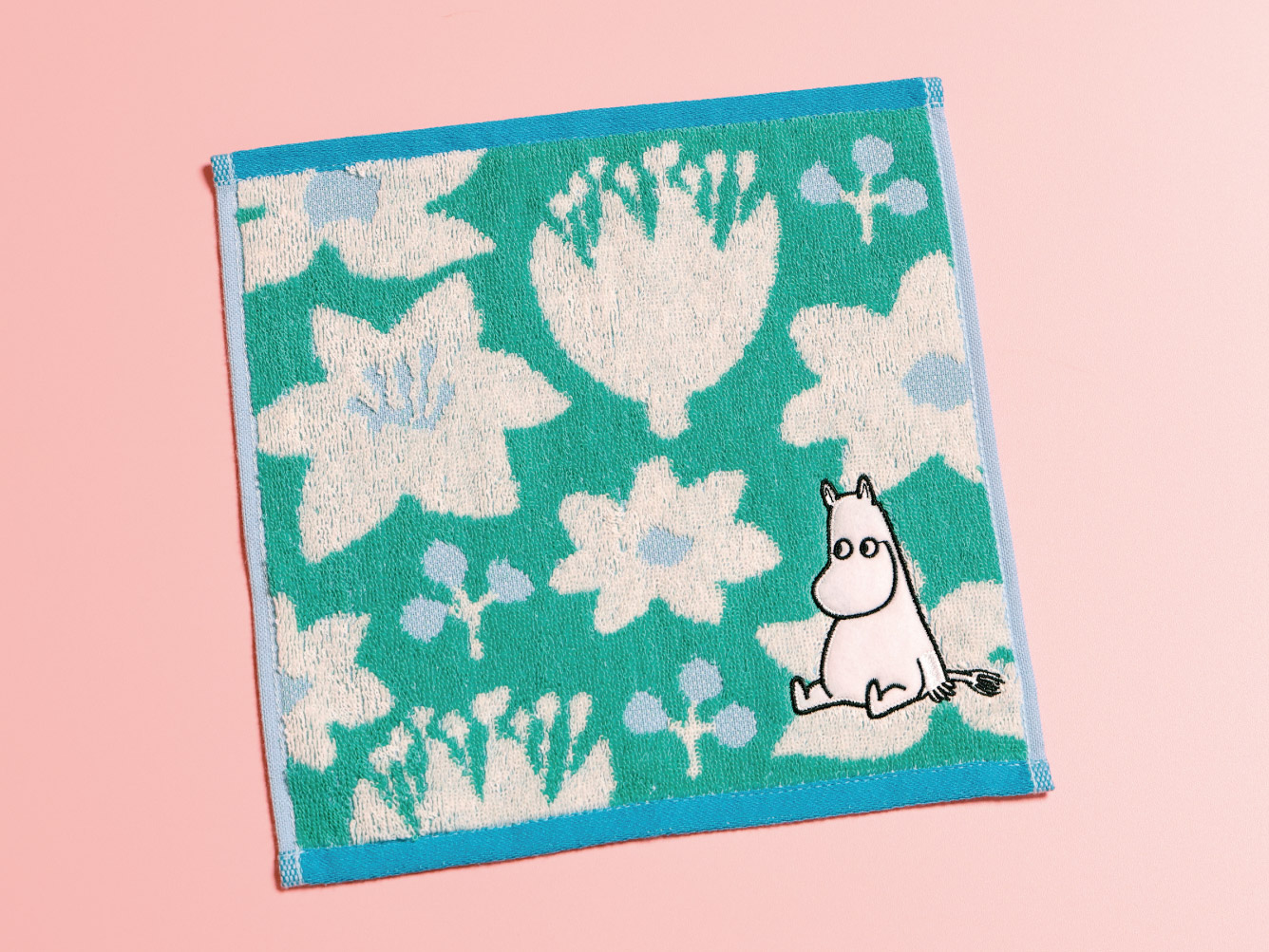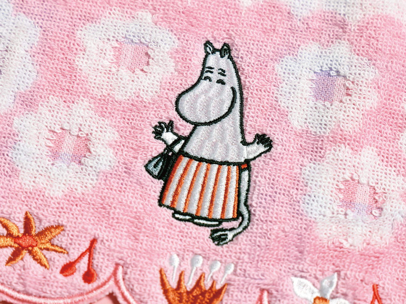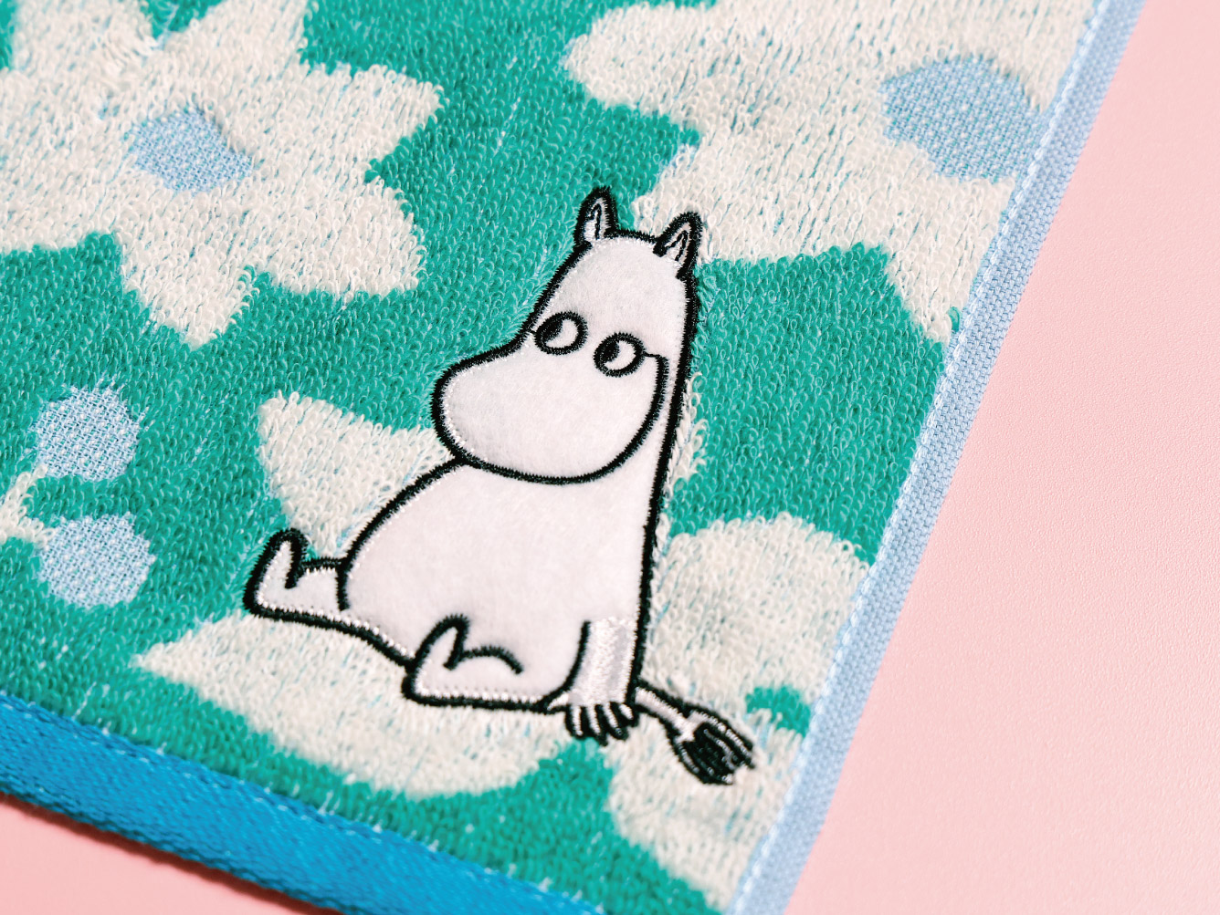 ②さわやかなカラーの花柄のタオル地に大きなムーミンのアップリケ刺繍が施された豪華な1枚です。