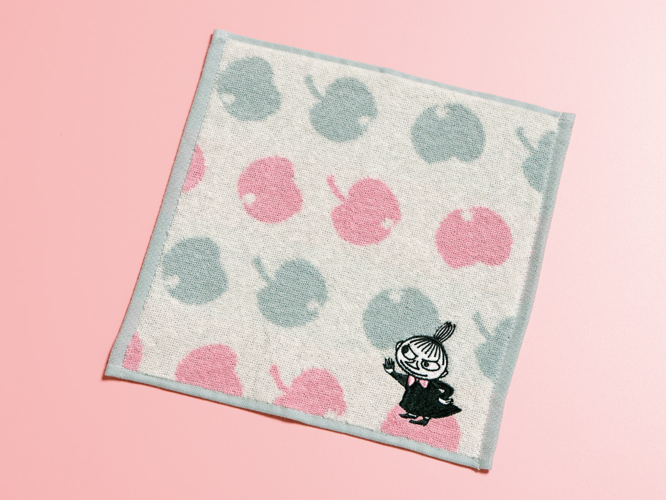 ①モノクロのリトルミイの刺繍と、ころころ転がっているようなりんごのパターンがおしゃれな1枚♪