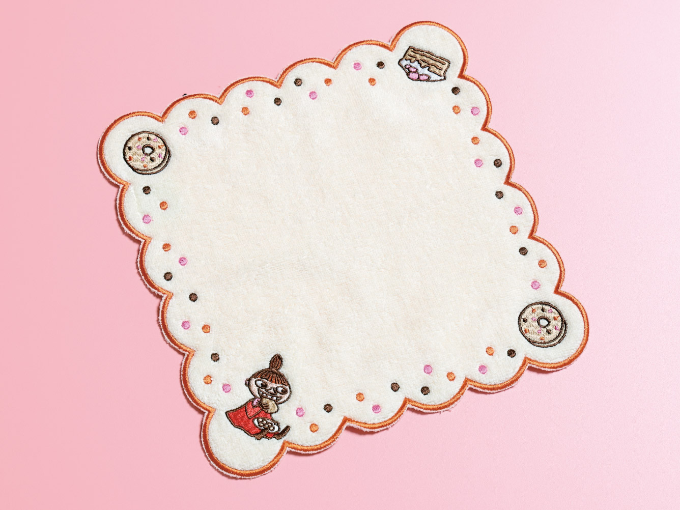 ④全体にスイーツの刺繍が施されたスカラップのタオルハンカチです。