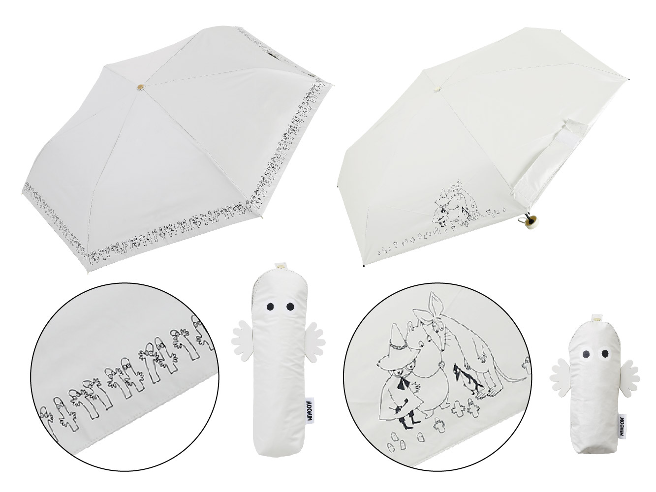収納ケースが「コンパクトなニョロニョロ」なので、傘本体にはニョロニョロが地面から生えてくるところを観察するムーミン、スナフキン、スニフの姿をプリントし、成長途中の短いニョロニョロを見ることができる遊び心あふれるデザインを加えました。(晴雨兼用コンパクト折りたたみ傘 ニョロニョロ/ホワイトミニ)昨年より継続のタイプは本体のデザインが一周ぐるっと全てニョロニョロ!ニョロニョロ好きさんへこちらもおすすめです。(晴雨兼用折りたたみ傘 ニョロニョロ/ホワイト)