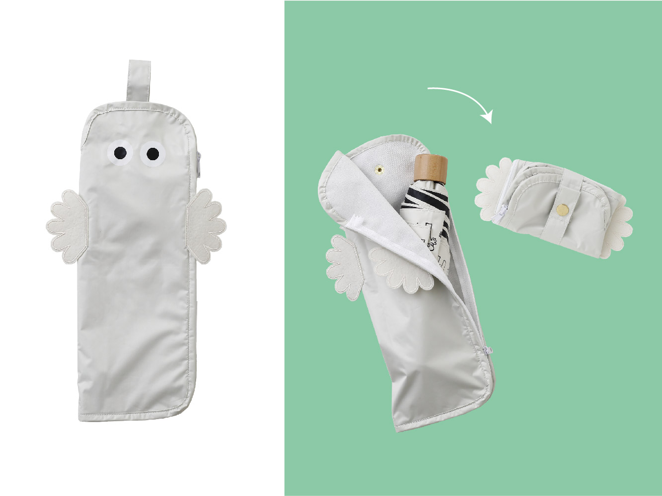 ニョロニョロの姿の袋の中がマイクロファイバーになっている吸水傘ケースも新登場です。小さくたたんで持ち歩くこともできますが、姿が可愛らしいのでぜひニョロニョロが見えるようにカバンに取り付けてご使用ください♪