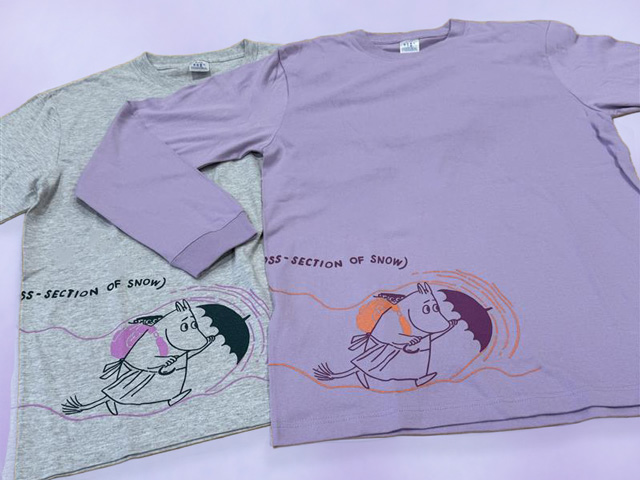 やわらかな素材感でのTシャツ。グレーとパープルの2色展開で、雪の中のムーミンママとクリップダッスのアートをあしらったデザインがポイントです。キャラクターの魅力を楽しめる一枚でカジュアルなコーディネートに取り入れやすいアイテムです。