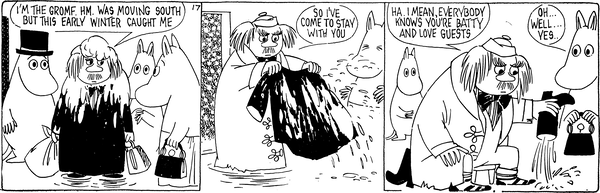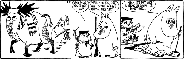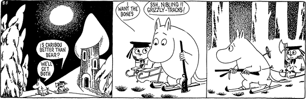 おとなしく眠ってくれるわけがないクリップダッス、あれやこれやと注文の多いフルフィンスとグリムラルン。ついに冬眠を断念したムーミンたちでしたが、そうなると食料が足りません。ムーミントロールはスキーを履いてトナカイかクマを探しに出かけます。