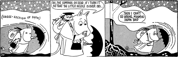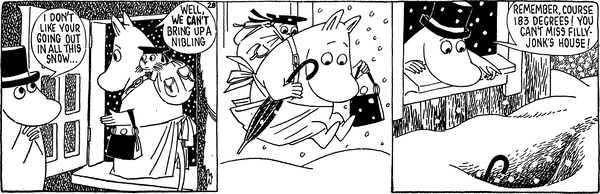 クリップダッスを郵送してきたのは、子育てに疲れてしまったクリップダッスのママ。穏やかに冬眠したいムーミン一家は、3人の子どもをしっかりとしつけているお隣のフィリフヨンカに託すのがよいだろうと判断。ムーミンママはクリップダッスをリュックに入れ、コンパスを片手に、傘で雪を堀りながら進んでいきました。