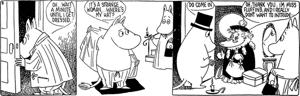 地面が凍ってニンジンが掘り出せなくなり、冬が来たと気づいたムーミンたち。今年はスポーツ大会やらキザなブリスクやらに振りまわされることなく、しきたりどおりに冬眠をしようと気合を入れてベッドに入りました。ところが、雪のなか訪ねてきた人に起こされてしまい、ムーミンパパは慌ててパジャマを脱いで帽子をかぶり、ムーミンママもネグリジェからエプロンに着替えて、お出迎えします。寝るときには服を着て、来客があると脱ぐという、思わずクスッと笑ってしまうシーンです。