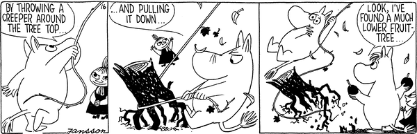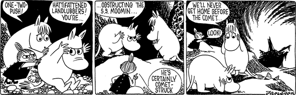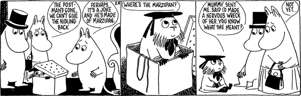 雪に閉ざされたムーミンやしきで、クリップダッスはみんなの隠しごとを暴いておもしろがり、弱みにつけこんで甘やかされようとします。ダイエット中と言いながら隠れてお菓子を食べるスノークのおじょうさん、コワモテだけどレース編みが趣味のグリムラルン、遠慮がちなご婦人なのにウィスキー党で兵隊さんごっこが好きなフルフィンス、裏表のないムーミンママにも秘密が!? 最後にはとてもトーベらしい、素晴らしいオチが待っていますので、続きはぜひコミックスをお読みくださいね。