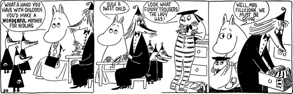 無事にフィリフヨンカ宅にたどり着いたムーミンママ。フィリフヨンカの失礼な物言いを受け流し、クリップダッスを引き取ってもらおうと試みます。それなのにクリップダッスときたら、きちんと整頓されたフィリフヨンカの引き出しを探り、隠してあったおもしろパンツを披露。