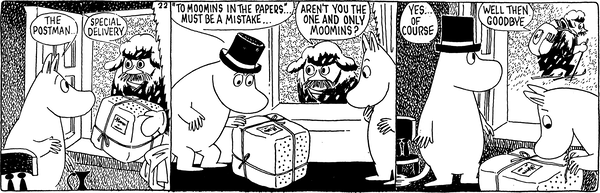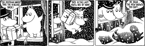 思わずフタを閉め直し、郵便屋さんに引き取ってもらおうと雪のなかに飛び出すムーミントロール。でも、残念、すでに郵便屋さんは行ってしまった後でした。