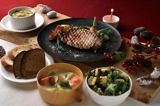 前菜は温かいサーモンミルクスープとサラダ、メインはヤンソンさんの誘惑に加え、エゾ鹿のステーキやフィンランドハム、魚介のグリル、エビとサーモンとホタテのクリームパスタの4種類からお1つお選びいただけます。