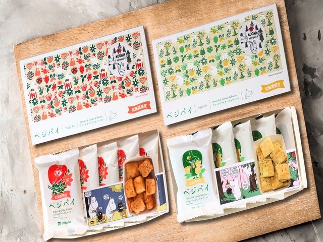 雄大な自然をコンセプトにポストカード5種、クリアファイル4種をラインナップ。このほか食と農業の持続性に貢献することを目指し、北海道産野菜を活用した新たなおみやげ菓子「ベジパイ」と新レーベルが特別コラボ。箱入タイプにはムーミンの名言しおり入り。6種類の絵柄がランダムで一枚入っています。