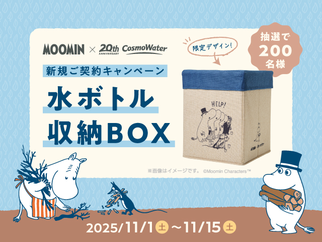 コスモウォーターのウォーターサーバーをご契約いただいた方から抽選で200名様に、MOOMIN×CosmoWater20周年限定デザインの「水ボトル収納BOX」をプレゼント!
