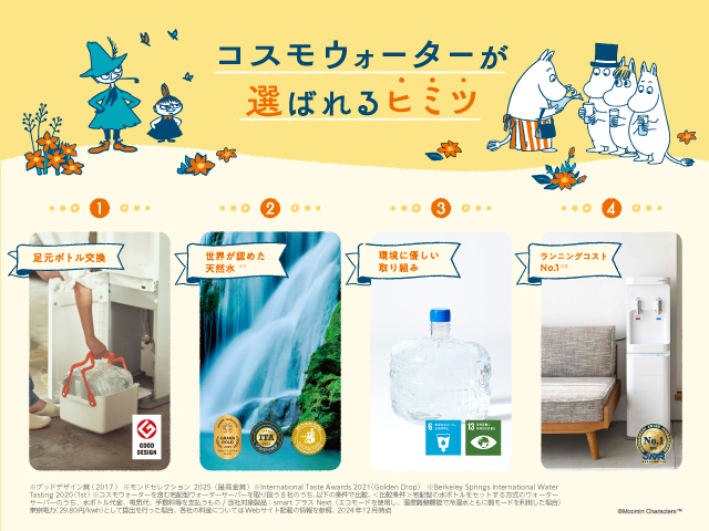 ブランド誕生20周年を迎えるウォーターサーバー「家族の天然水 CosmoWater」が、自然豊かな北欧生まれの物語「ムーミン」とコラボレーションしています。