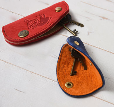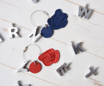それぞれにムーミン、リトルミイの型押しが入った革製チャーム、