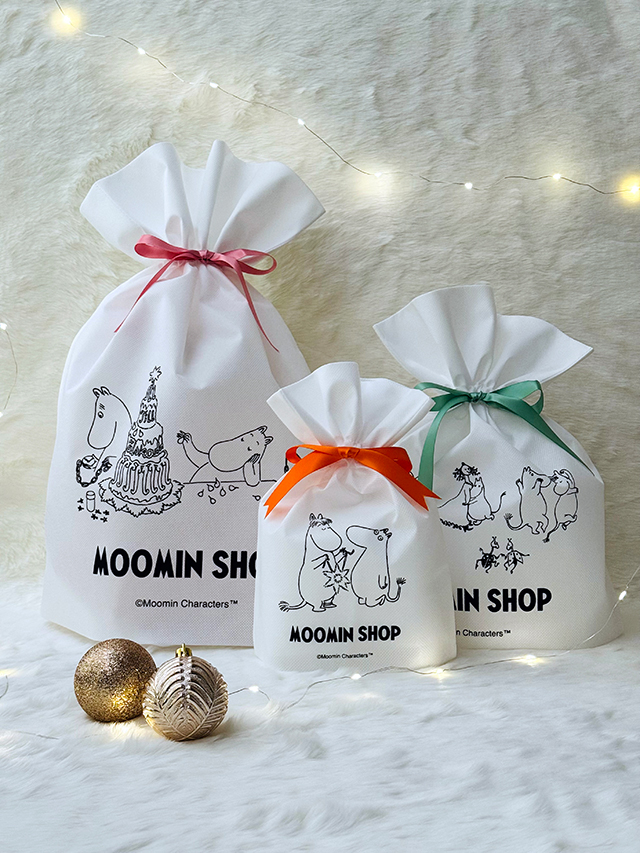 ムーミンショップでは、小説『ムーミン谷の彗星』のアートでデザインされたオリジナル巾着でお包みする、有料のラッピングサービスもご用意しています。