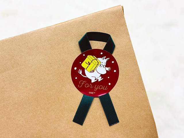 ギフトラッピングをご希望の商品は、ムーミンがプレゼントを運んでいるような、可愛いリボンシールでお包みいたします。