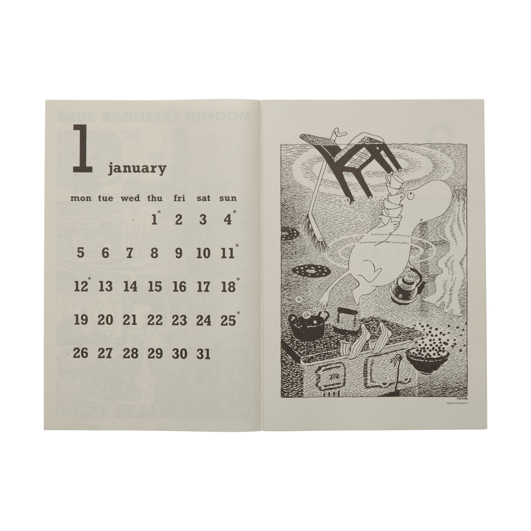 トーベ・ヤンソンがタブロイド紙にも作品を掲載していたことにちなんで、ブラックインキで印刷されたタブロイドスタイルのカレンダーが今年も登場しました。