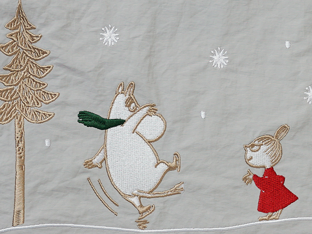 ムーミンとリトルミイの一コマが丁寧な刺繍で表現されています。