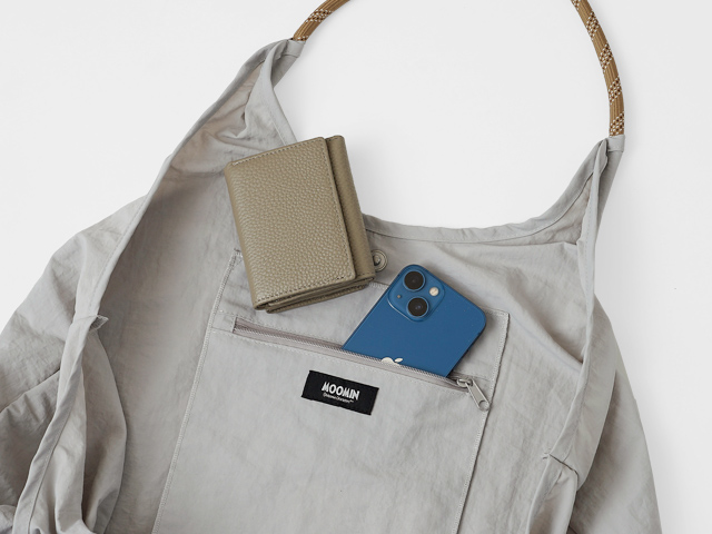 財布やスマホなど仕舞えるファスナー付きポケットが内側にについているので貴重品を入れても安心。