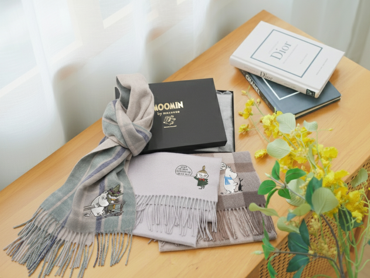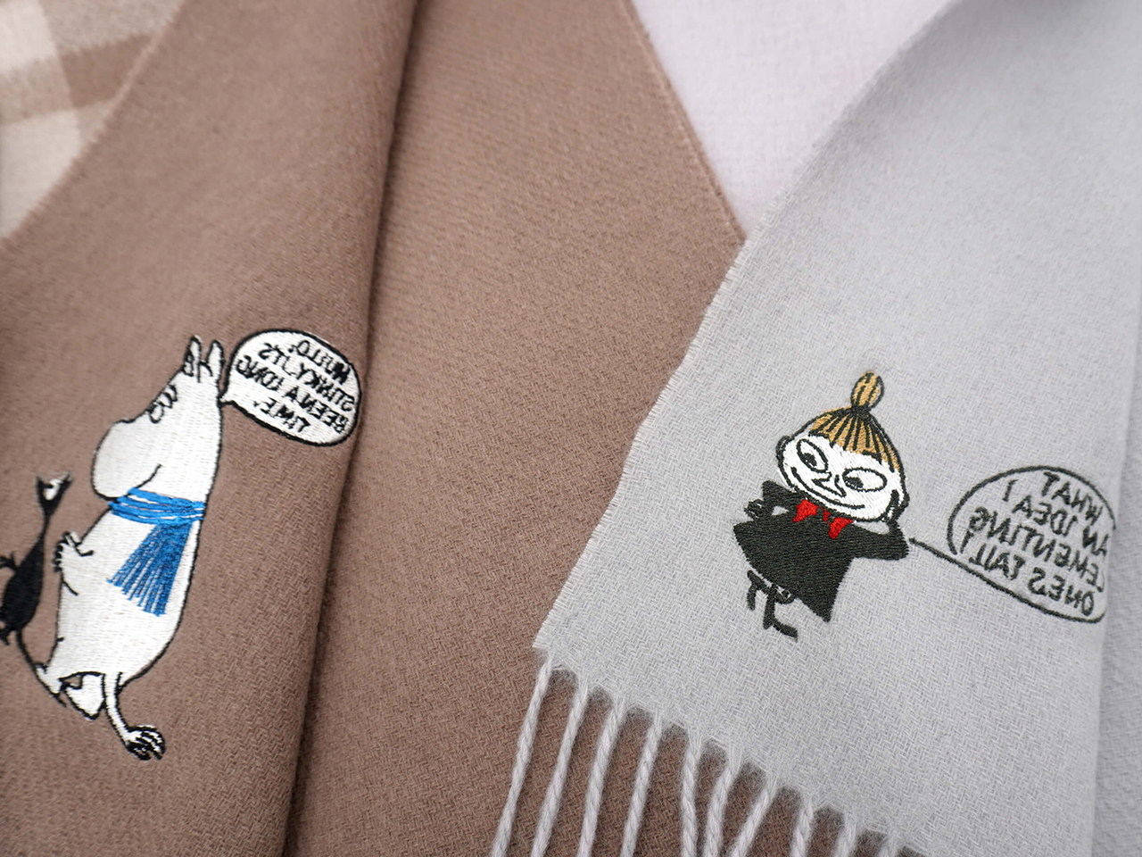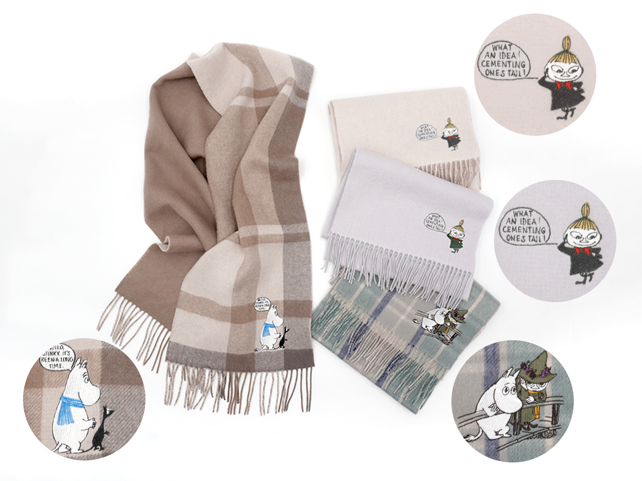 macoccaでギフトの需要も特に高い人気のロングセラー商品「カシミヤリバーシブルマフラー」をベースにムーミン谷の仲間たちのグラフィックを刺繍しました。ムーミン、スナフキン、リトルミイのそれぞれ異なるシチュエーションで3種類の刺繍、合わせやすい4色のカラーをご用意しました。