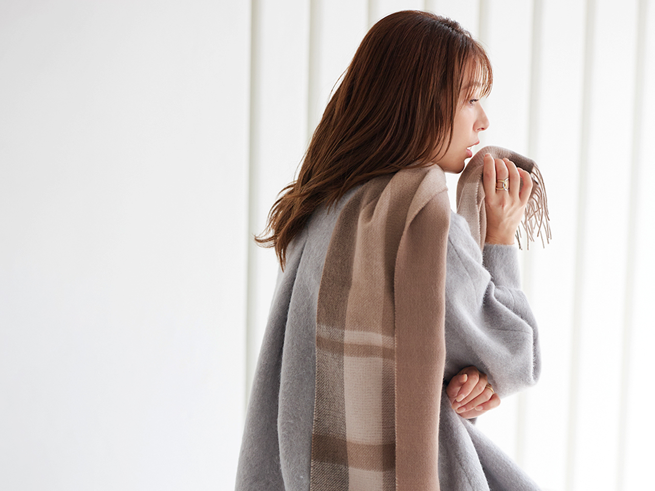 このマフラーはカシミヤ100%。しっとりとしたやわらかさがあり、首元を極上の心地よさで包み込みます。カシミヤならではのなめらかな肌触りは、一度触れると手放せなくなるほどの特別感があります。