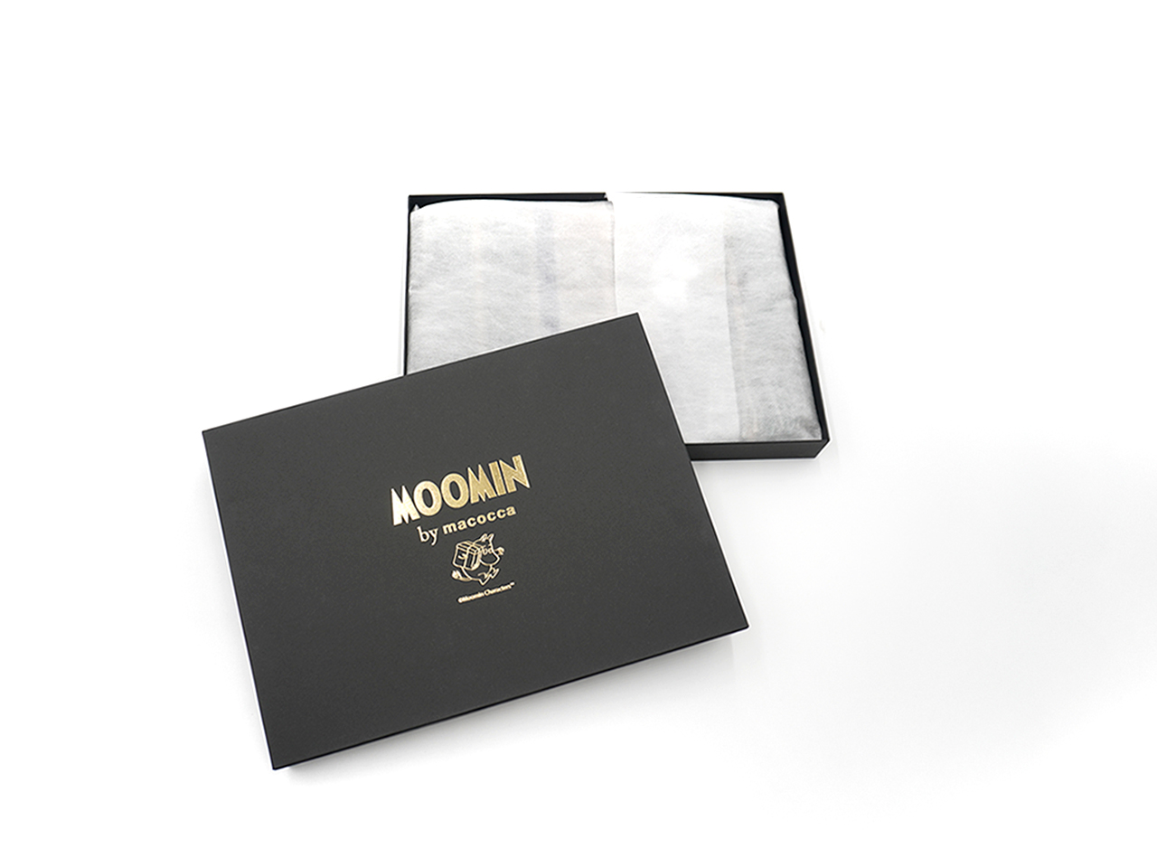 また、セットになったパッケージは、この商品の為にデザインされた特別仕様。ギフトボックスを抱えるムーミンが箔プリントされた、高級感あふれるパッケージ。大切な方へ贈る「特別」を、愛らしいムーミンの世界観でやさしく包みます。