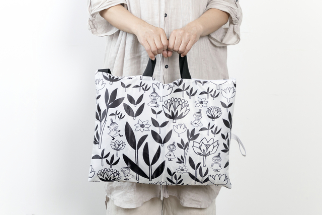 大人クールな北欧デザイン。さまざまな表情の「リトルミイ」がバッグ全体を彩り、使うのが楽しくなります。バッグ本体サイズ33.5×43cm。耐荷重約7kg。